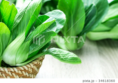 close up the Fresh baby green bok choy in basket