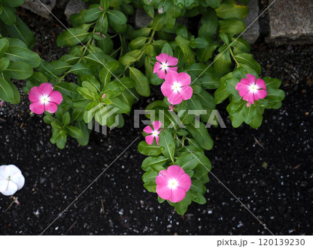 ピンクと白のニチニチソウ(日日草の花と葉っぱ)