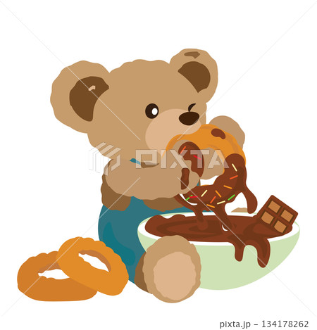 ドーナツにチョコレートをたっぷりつけて食べるクマのぬいぐるみのイラスト
