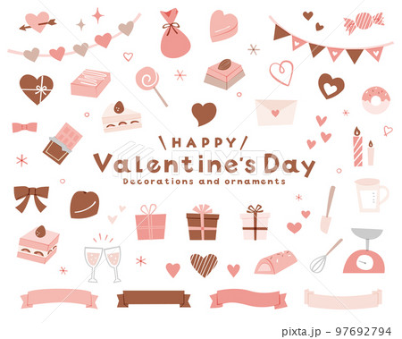 バレンタインデーの手描き風飾りイラストのセット アイコン リボン 装飾 チョコレート ケーキ お菓子