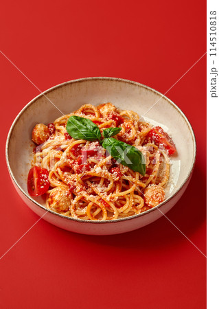 Spaghetti with tomato sauce, meatballs, Parmesan and basil