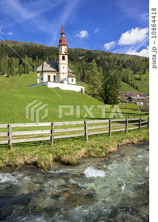 Val Gardena, South Tyrol, Italy. Alpine scenery. Beautiful Dolomites mountains. view of San Giacomo church near Ortisei village.