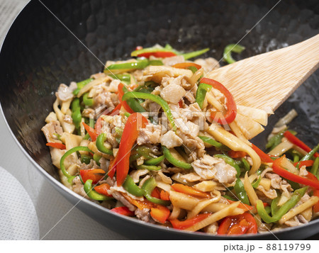 青椒肉絲(チンジャオロースー)、豚ロース細切り、ピーマン、パプリカ(赤・黄色)使用。中華料理。
