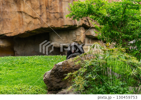 Chimpanzee Relaxing Behind Rock in Lush Green Enclosure