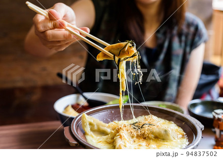 Gyoza with melt cheese raised by chopsticks. Japanese food.