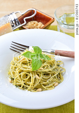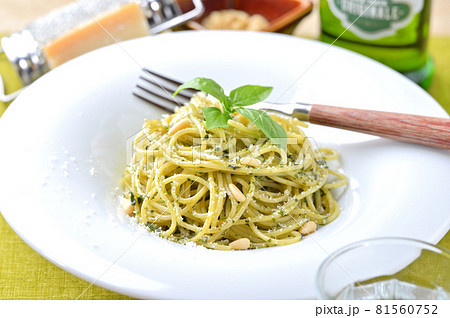 イタリアンパスタのジェノベーゼ、ジェノバソース、バジルソース、バジルと松の実とチーズのスパゲッティ。