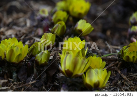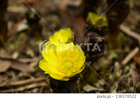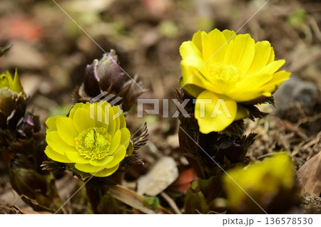 フクジュソウ(福寿草)の黄色い花の風景