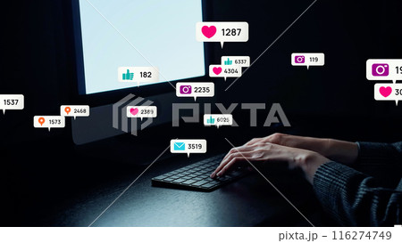 暗い部屋でパソコンを使う女性とSNSイメージ