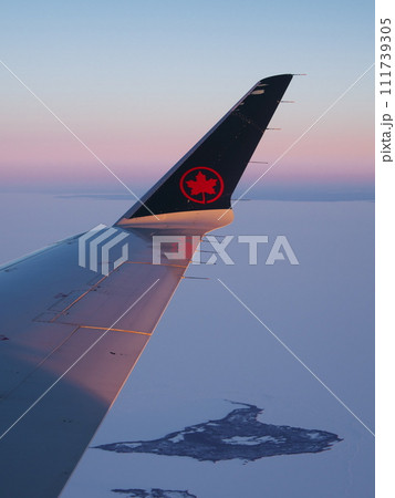 夕方の雪原上空を飛ぶ エア・カナダ カナディア リージョナルジェット CRJ-900の翼