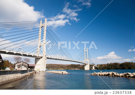 本州と離島の能登島を結ぶ吊り橋「ツインブリッジのと」と青空|石川県七尾市