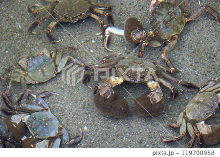上海蟹と同族で脂がのったこの時期美味しい。生きたモクズガニの写真