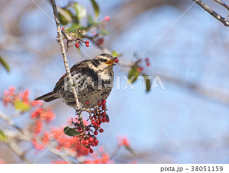 クロガネモチの赤い実をついばむツグミ
