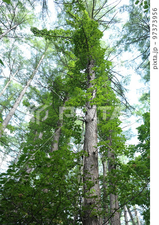 北海道稚内市沖の日本海上の礼文島の礼文岳に登るトレッキングコース沿いの白樺の古木に絡みつくツタウルシ