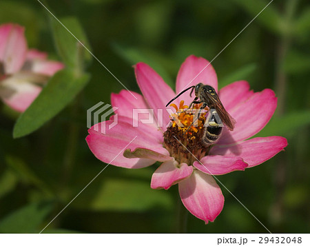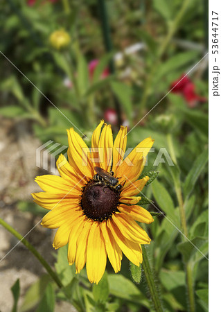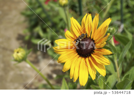 ヤグルマギクを訪れたオオハラナガツチバチのオスと思われる蜂、花と昆虫イメージ素材