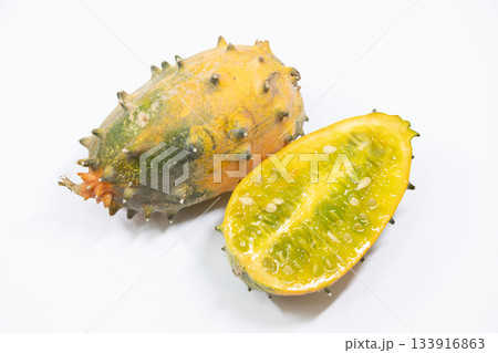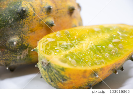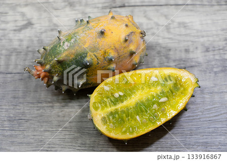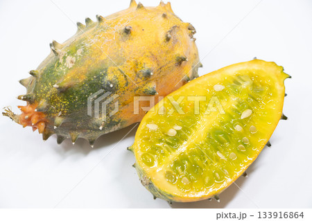 Kiwano, horned melon, whole and half fruit