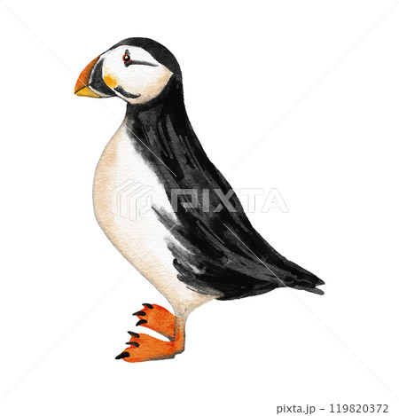 Hand drawn illustration of puffin seabird. Nordic atlantic north animal cute funny creature character, flat design, zoo wildlife polar fauna, adorable fly portrait on white background, orange beak and