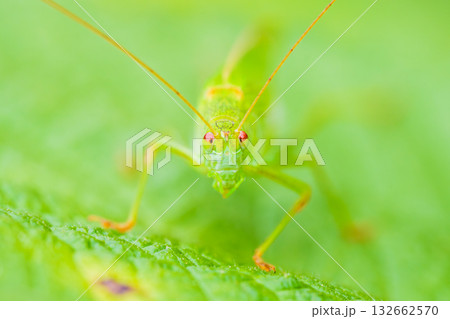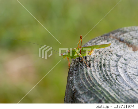 全体に草緑色して明るい草地や背の高い色部の上にいるキリギリスの仲間ツユムシ