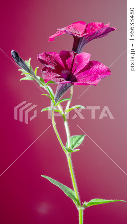 Stunning magenta petunia with green stem on bold red background for marketing and editorial purposes