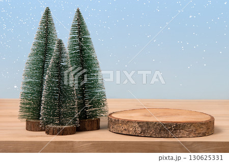 Winter background with wooden cylindrical empty podium display for promotions and for showing product decorate. Stage pedestal or platform between Xmas trees on gray table. Merry Christmas celebration