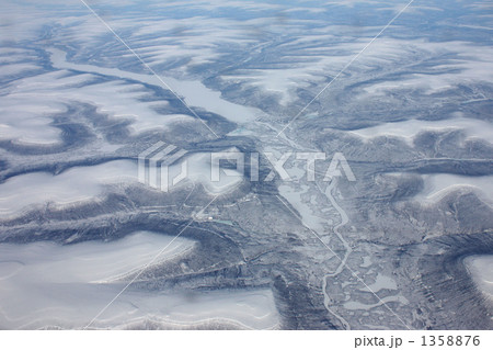 ヨーロッパ行きの飛行機の窓からツンドラの氷河を見下ろす