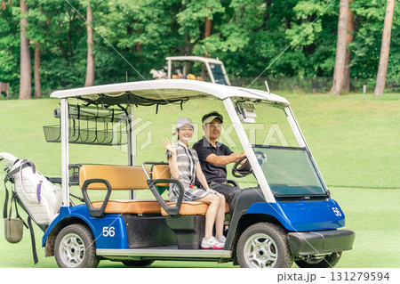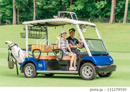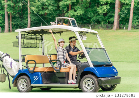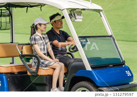ゴルフ場でゴルフカートに乗るゴルファーの男女