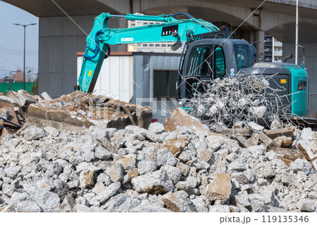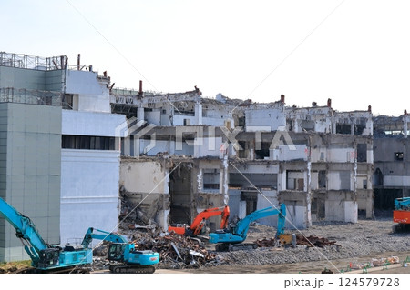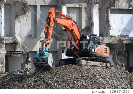 鉄筋コンクリート建物の解体工事現場(重機作業)