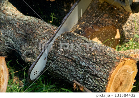 Lumberjack. Sawing a tree trunk with a chainsaw