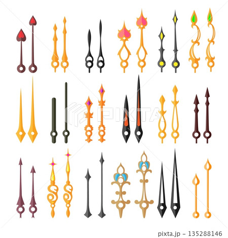 Golden antique clock hour and minute hands. Old clockwork. Seconds dial element. Decorative timepiece. Long and short time pointers. Retro elegant design. Vector set on dark background
