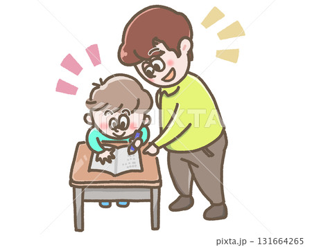 机で勉強する男の子と先生のイラスト