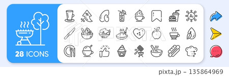 Food, Food delivery and Frappe line icons for web app. Glare of light effect. Message icon. Pack of Ice cream, Cooking timer, Mint leaves pictogram icons. Orange, Love coffee, Wine glass signs. Vector
