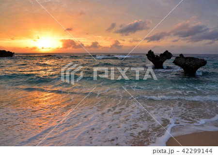 夕陽に染まる沖縄本島の古宇利島のハートロック(ティーヌ浜)