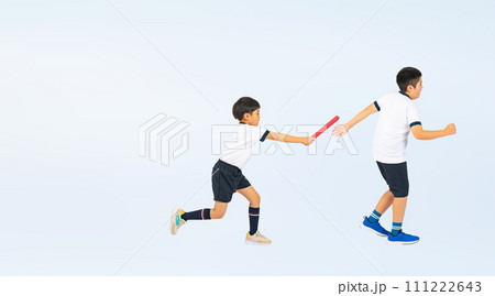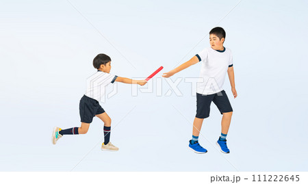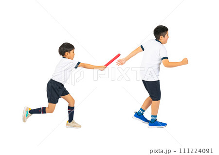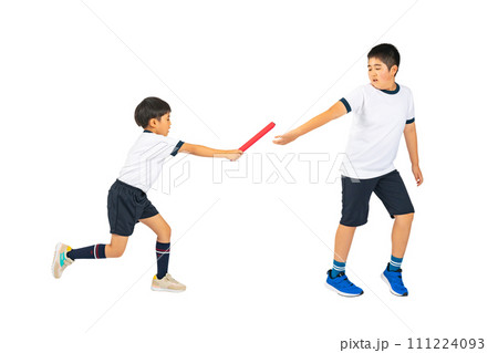 バトンをリレーする体操服を着た男の子たち 手作業で精密に切り抜いた背景透過全身写真PNG