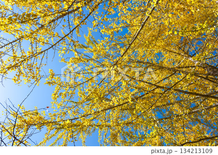 青空を埋め尽くすように広がる、黄金色に輝くイチョウの枝葉