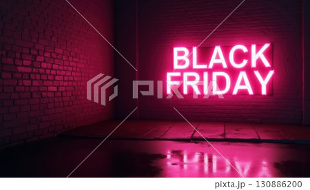 A vibrant neon "BLACK FRIDAY" sign glows brightly on a dark brick wall in a dimly lit room, reflecting pink light onto the wet, reflective floor below.