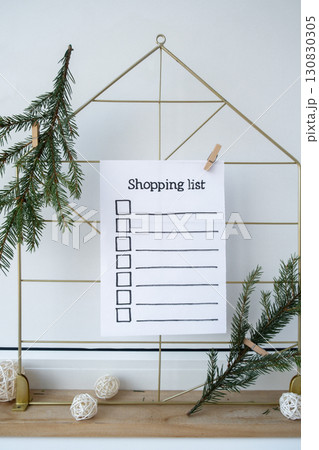 Holiday preparation paper note with SHOPPING LIST checklist text. Vision board wall with cozy minimalistic handmade new year Christmas decor Low key festive celebration