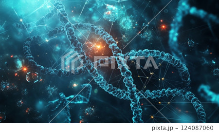 The image showcases intricate DNA strands intertwined within a vibrant molecular environment teeming with diverse particles and glowing elements, illustrating the complexity of genetic structures.