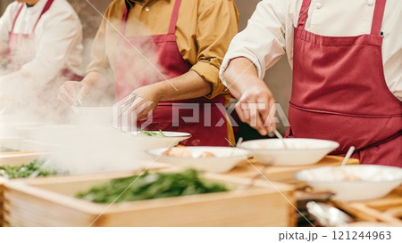 Chefs in red aprons prepare dishes, steam rising from ingredients, cooking concept.