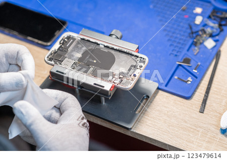A technician carefully replaces a smartphone battery while working in a clean, organized repair workspace