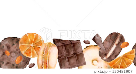 Watercolor citrus and truffle macarons, chocolate bar pieces, orange slices. Isolated hand painted seamless illustration for endless banners, kitchen fabric borders, food branding, sticker sheets.