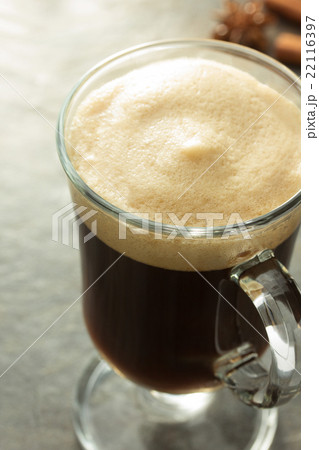 Indian tea masala chai. Seasoned chai masala tea with milk and spices on a gray background.