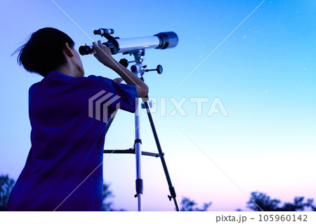 夜空のもとで天体観測をする小学生の男の子