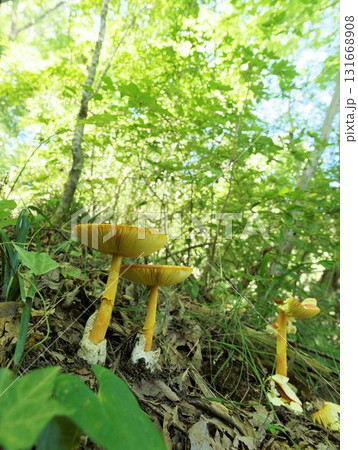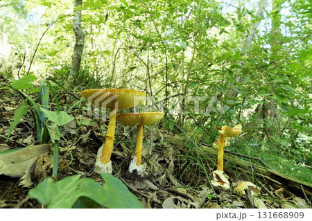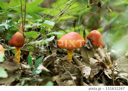 【国指定天然記念物】鯉ヶ窪湿原 初秋の遊歩道に生えたタマゴタケ2 岡山県新見市