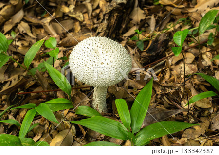 若いイボイボ卵型の猛毒テングタケキノコ幼菌(自然環境下菌・キノコ類マクロ撮影)