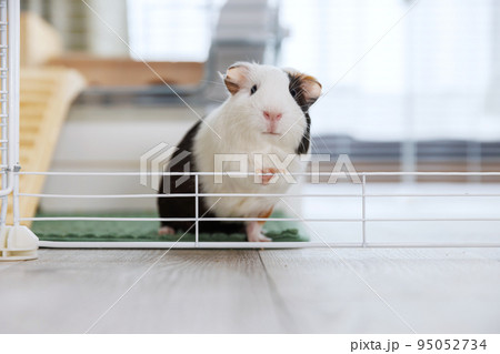 Guinea pig (latin name Cavia aperea f. porcellus) is resting near small house.
