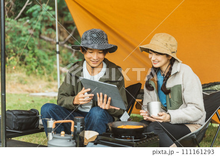 秋冬のキャンプ場でタブレットPCを見ながらキャンプをする男女のキャンパー(Wi-Fi・電源サイト)