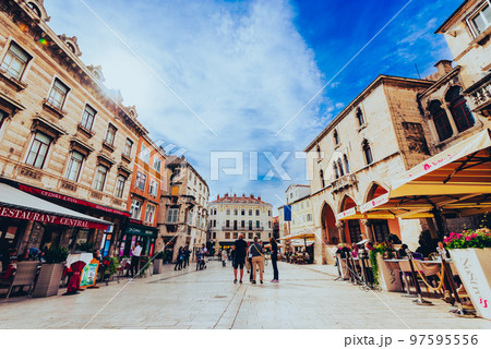 クロアチアのスプリット旧市街の路地にはレストランやカフェが多くあり、観光客で賑わっている。