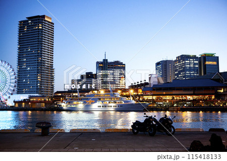 横浜みなとみらいの夜景 ピア赤レンガ桟橋に停泊中のマリーンルージュ