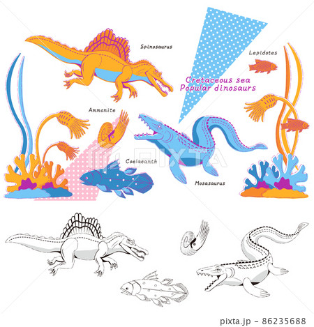 モササウルスやスピノサウルス 白亜紀の海の人気恐竜のレトロ風デザインと線画
