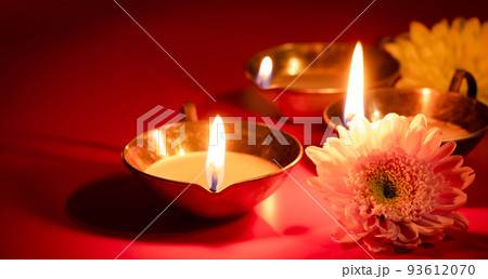 Happy Diwali. Diya oil lamp and flowers on red background. Traditional Hindu celebration. Religious holiday of light.