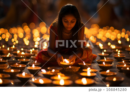 A portrait of beautiful young Indian girl holding lit diva during Diwali festival with many lit divas in the background